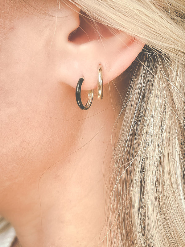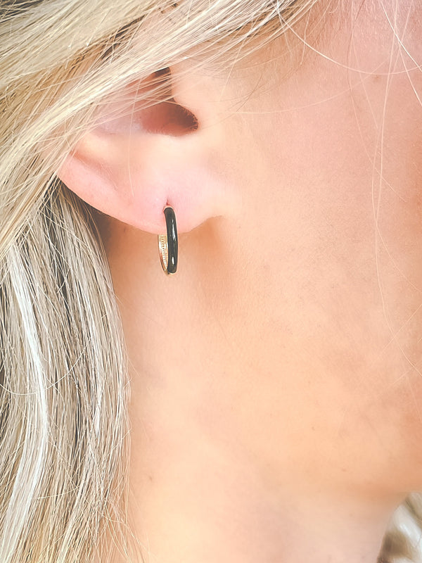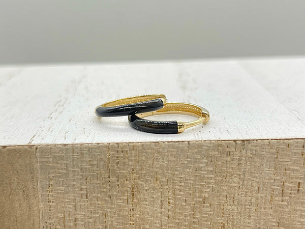 An everyday, casual classic. These small earrings measure 11mm in diameter and 2mm in width.  Get two pairs in one with the half black enamel and half high-polished 14 karat yellow gold hinged huggies. Wear the black side facing forward for a little fire, or put them in backwards with the gold side turned out for a more traditional look.